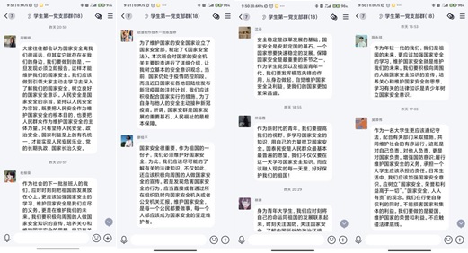 支部党员从什么是国家安全、国家安全相关法律、公民在维护国家安全中应尽的义务等多方面作了深入学习,并围绕“我的国家安全观”这一主题,各抒己见,深入交流探讨。学生党员周雅婷在交流中说道:“大家往往都会认为国家安全离我们很遥远,但其实它就在我们的身边,我们要做到一旦发现必须立即报告,这样才能维护我们的国家安全。我们应该做到引领大家主动去学习去深入了解我们的国家安全,树立良好的国家安全意识。只有坚持人民安全、政治安全、国家利益至上的有机统一,才能实现人民安居乐业、党的长期执政、国家长治久安。”其他学生党员结合思想实际纷纷表示,要提高警惕,保持鲜明的立场,提高判断和分析事物的能力;保持鲜明立场,提高政治辨别力,自觉遵守国家法律法规,坚决与危害国家安全的行为作斗争,做到维护国家安全,保守国家秘密。