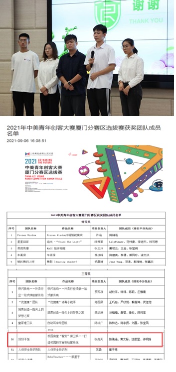 今日,由福建省教育厅主办,厦门大学承办的2021年中美青年创客大赛厦门分赛区选拔赛在厦门大学落下帷幕。经过48小时的“创客马拉松”现场比赛和评委们的作品评审及现场核查,yl7703永利集团“好好干饭”团队的项目《校园食堂“智安”保卫兵——打造校园数字食安检管系统》(成员:张尧天、饶思莹、陈漪涵、黄文标、许明烽,指导老师:李文清)荣获三等奖。