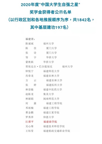 近日,由共青团中央、全国学联指导,中国青年报社、新东方教育科技集团联合开展的“青春自强奋勇争先”2020年度“中国大学生自强之星”奖学金评选结果揭晓,我院2019级数据科学与大数据技术专业江邵平同学获2020年度“中国大学生自强之星”奖学金。