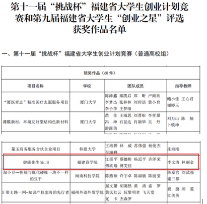 由团省委、省教育厅、省人社厅、省科协、省学联联合举办,阳光学院、共青团福州市委承办的第十一届“挑战杯”福建省大学生创业计划竞赛已落下帷幕,我院参赛项目《健康先生Mr.H》荣获银奖。